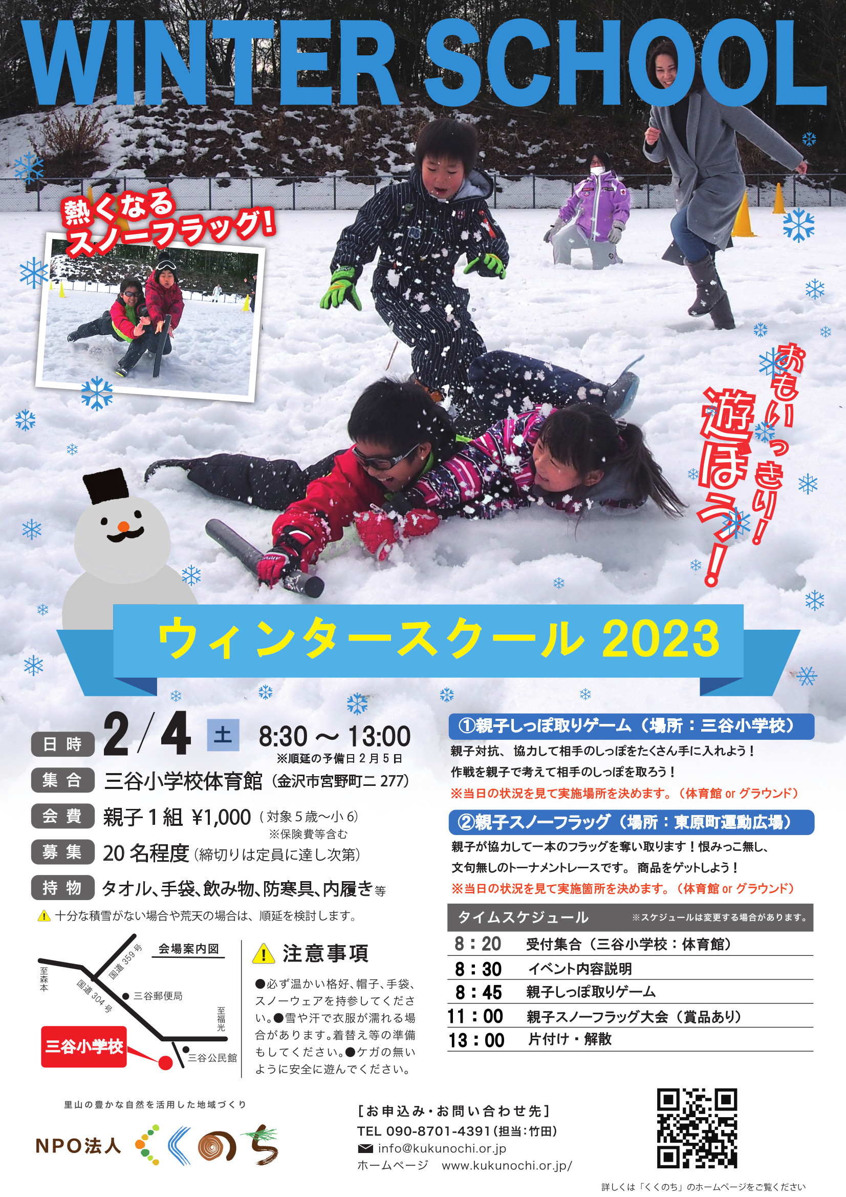 ご参加される方の住所、氏名(保護者とお子様)、ご参加人数、年齢or学年、電話番号、メールアドレスをお知らせください。