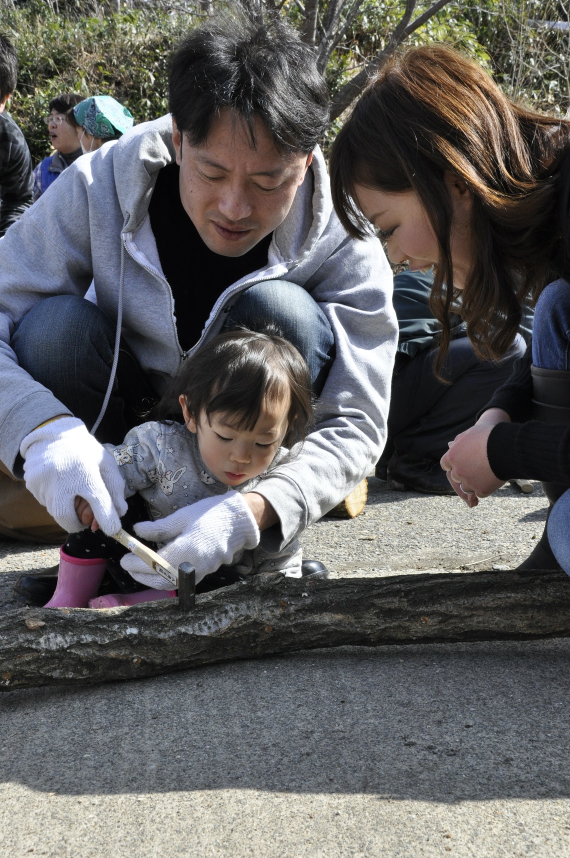 当日は、春が感じられるぽかぽか陽気に包まれた日になり、きんしん環境財団が整備している森を散策したのち、地元の方とくくのちの指導のもと、親子でクヌギの原木にきのこの菌を打込みました。