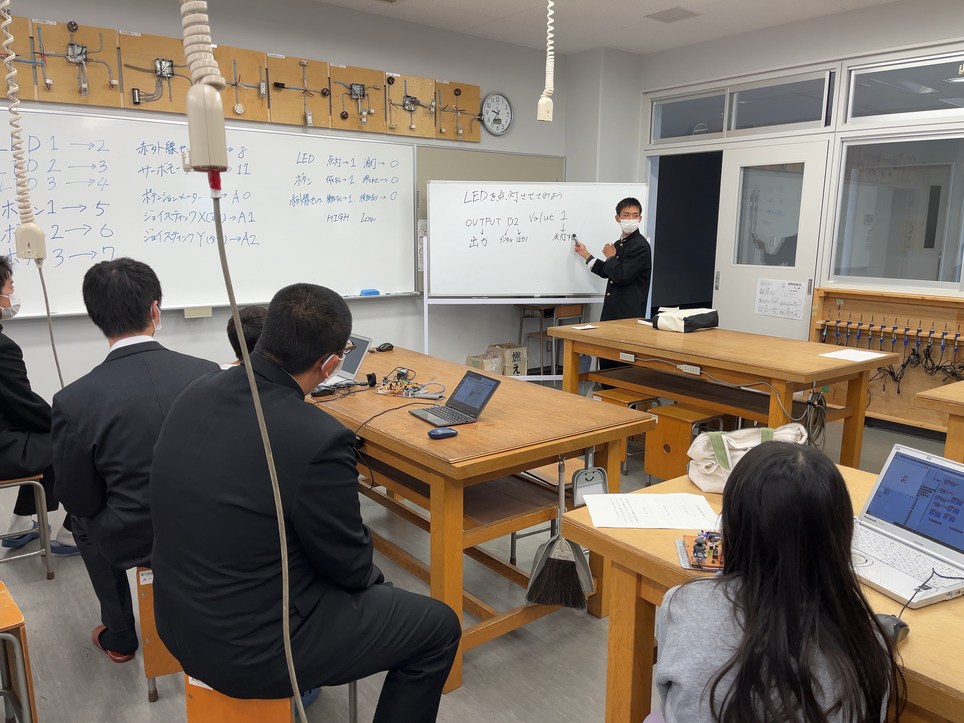 今回は、金沢北陵高等学校、金沢市立工業高等学校の高校生が講師となって、プログラミングでLED、ブザー、モーター、ジョイコン等を制御する基礎を学びました。