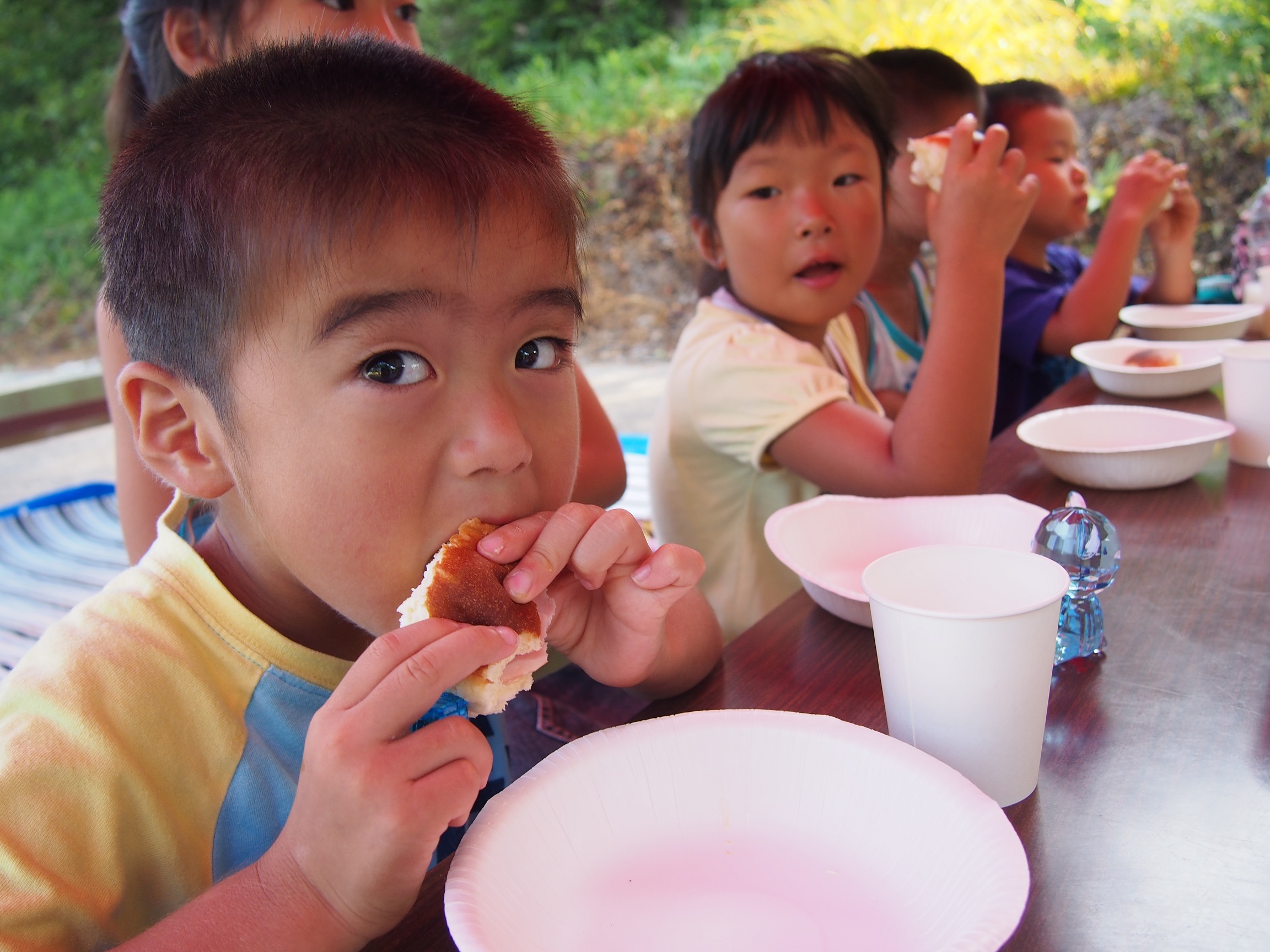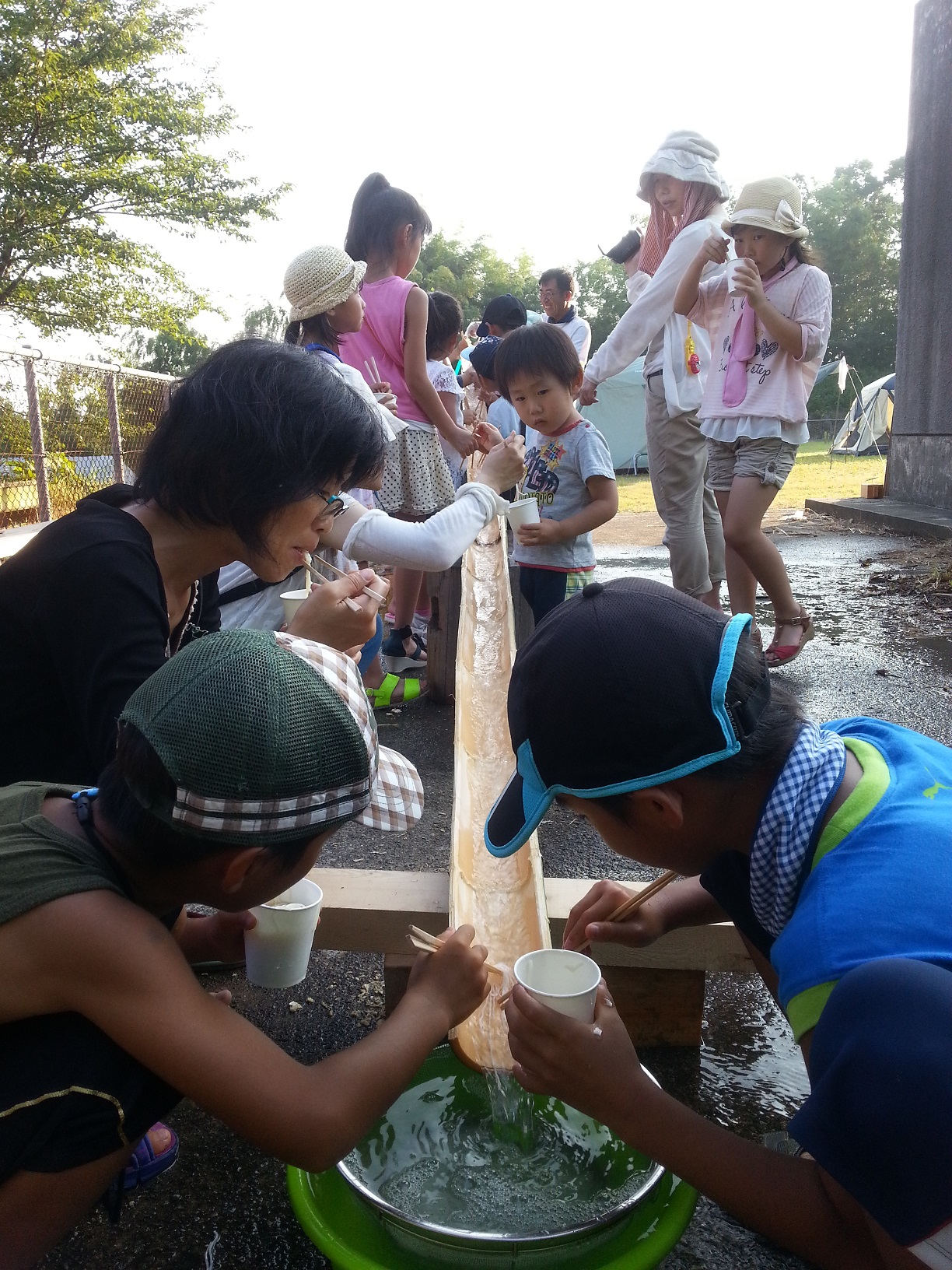 まずは、皆で汗だくになってテント張り。そして、流しソーメンの竹を準備する班と収穫したトマトの袋詰めの班に分かれての体験作業。「もっと流して」、「速くて食べれな~い」、「美味し~い」と流しソーメンは子供達に大人気。竹の飯盒での炊き込みご飯。これが実に旨い!