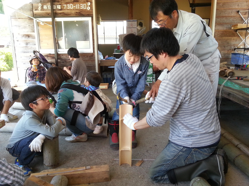 保全活動で汗を流した後は、親子で竹を加工してプランターづくり。