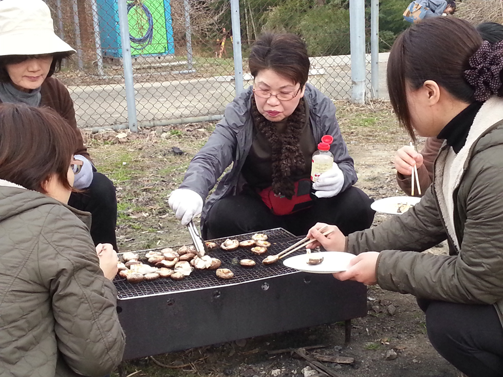 最後は、前年に植菌してあった、シイタケ採りと東原町会の方に焼きしいたけを作ってもらい、美味しそうに頬張っていました。シイタケの嫌いな子供もなぜかこの日は、みんなと一緒にカブリついているんですよね~。